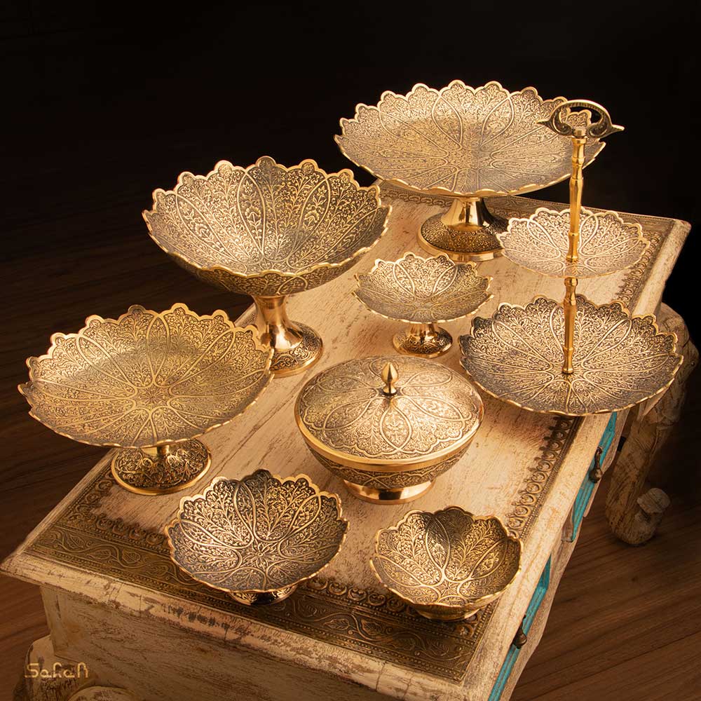 - ست کامل شامل: یک عدد میوه خوری – یک عدد آجیل خوری – دو عدد خرما خوری – یک عدد شیرینی خوری دوطبقه – یک عدد شیرینی خوری پایه دار – یک عدد شکلات خوری – یک عدد کاسه