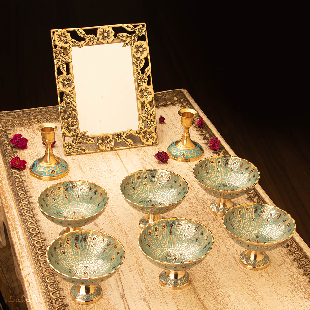 - ست کامل شامل: یک آینه – یک جفت شمعدان – شش عدد کاسه