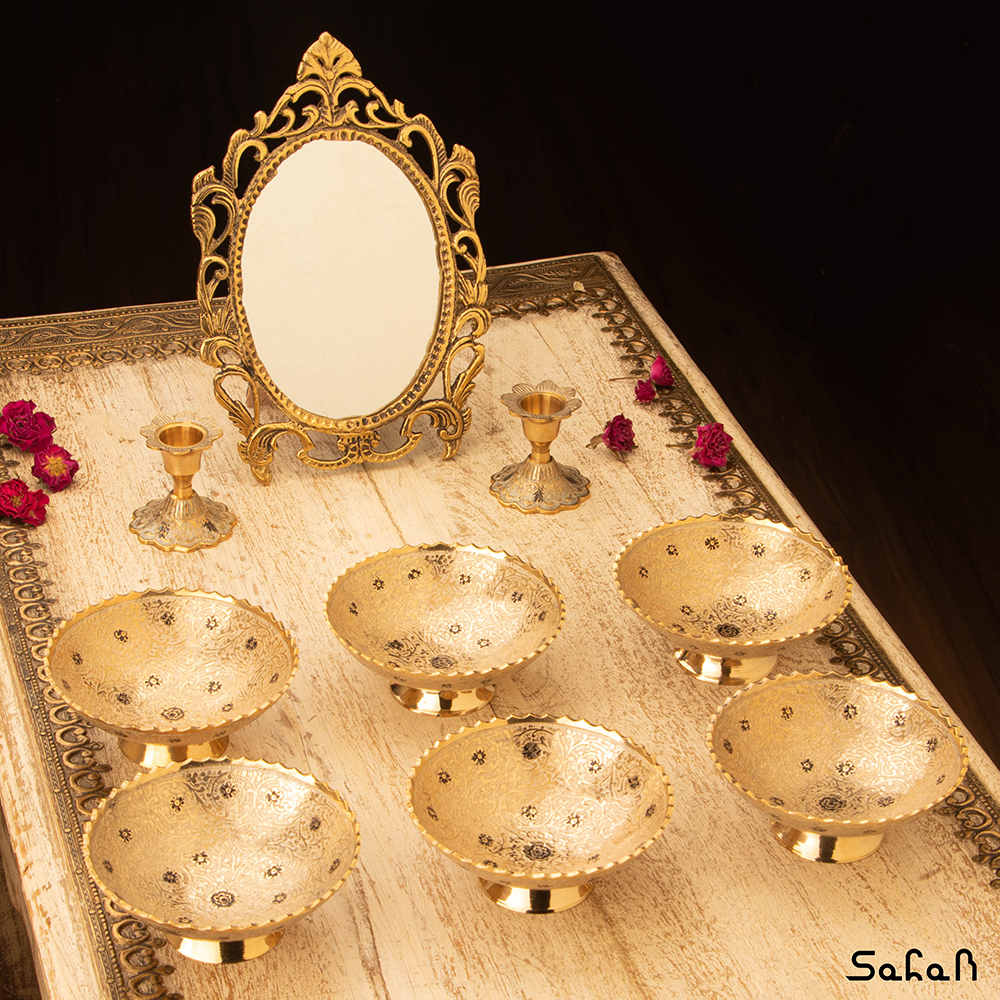 • ست کامل شامل: یک آینه – یک جفت شمعدان – شش عدد کاسه
