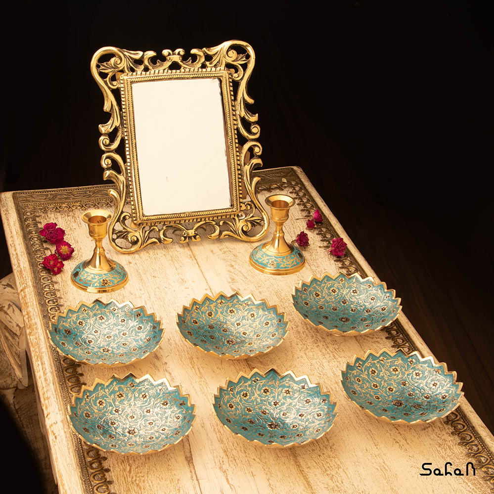 • ست کامل شامل: یک آینه – یک جفت شمعدان – شش عدد کاسه