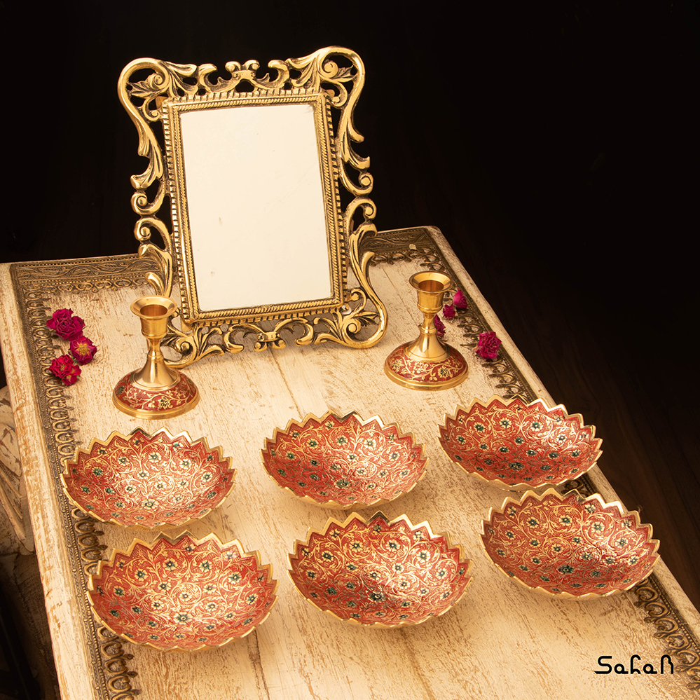 - ست کامل شامل: یک آینه – یک جفت شمعدان – شش عدد کاسه
