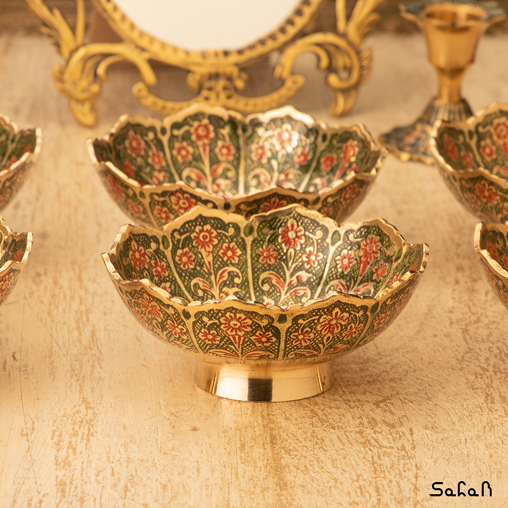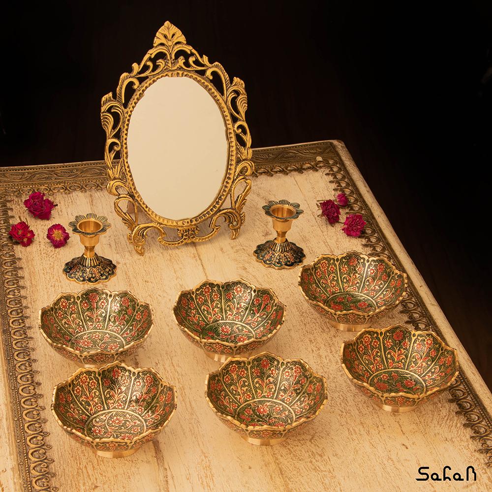 • ست کامل شامل: یک آینه – یک جفت شمعدان – شش عدد کاسه