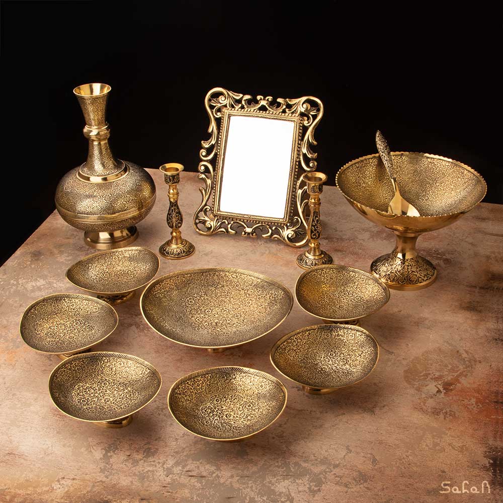 - ست کامل شامل: یک عدد آینه – یک جفت شمعدان – یک عدد گلدان – یک عدد آجیل خوری – یک عدد قاشق آجیل خوری – یک عدد شیرینی خوری پایه دار – شش عدد کاسه پایه دار